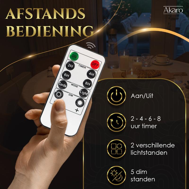 Met de bijgeleverde afstandsbediening heb je de keuze uit twee lichtstanden: flikkerend en statisch licht. Zelfs tijdens het gebruik van deze lichtstanden kan je de dimfunctie gebruiken om een realistische sfeer in jouw huis te creëren. Deze unieke functie is exclusief beschikbaar voor de Akaro kaarsen en zal je niet bij andere aanbieders vinden.