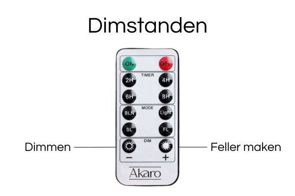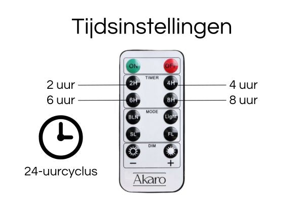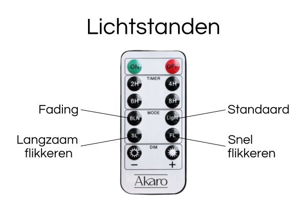 Al onze LED kaarsen en waxinelichtjes worden met afstandsbediening geleverd. Hieronder zie je een overzicht van de tijdsinstellingen, lichtstanden en dimstanden.